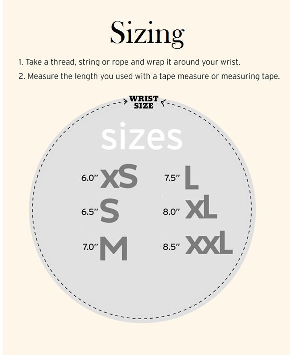 Wrist Measurement: Use either a seamstress tape or flexible tape measure (You can also use a piece of string or yarn and a ruler). Wrap it around the area you wish the bracelet to fit snugly. I will add the necessary measurement to make it fit comfortably. DO NOT USE ANY PREVIOUS BRACELETS TO GET A MEASUREMENT. I am not responsible for measurements given incorrectly.